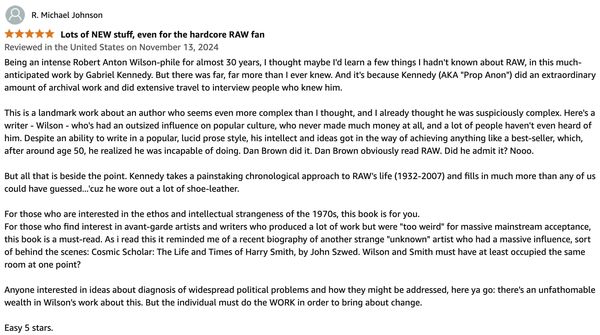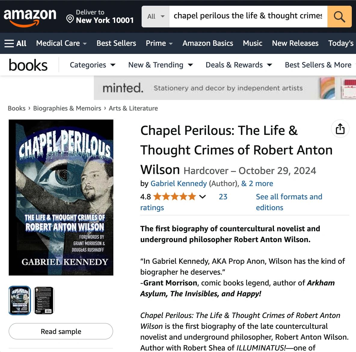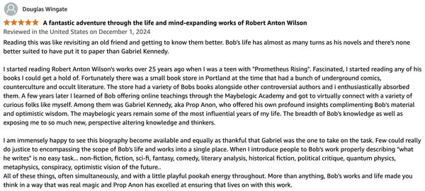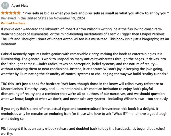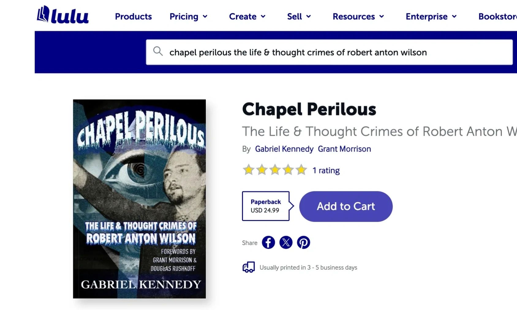 LULU.COM offers an alternative to shopping at Amazon. As a Certified B Corporation, LuLu is committed to balancing purpose and profit. Chapel Perilous: The Life & Thought Crimes of Robert Anton Wilson is currently available in paperback.