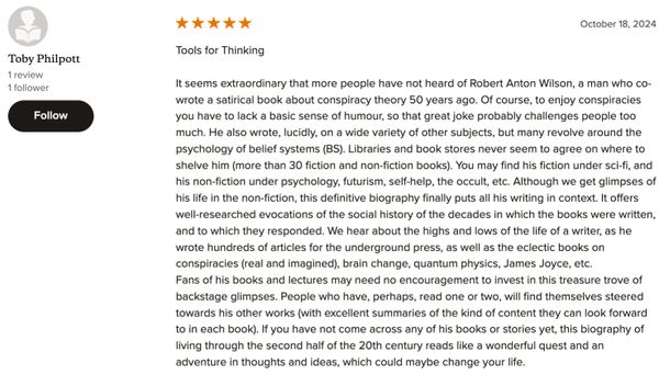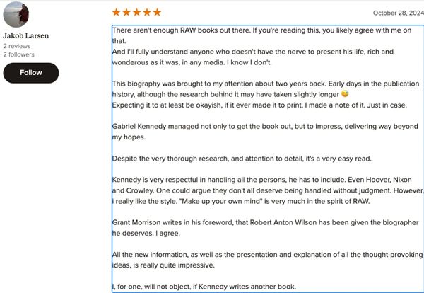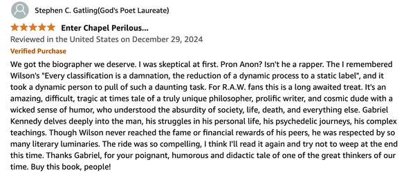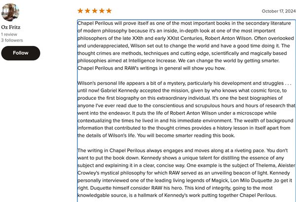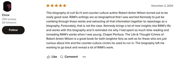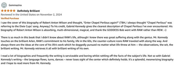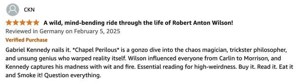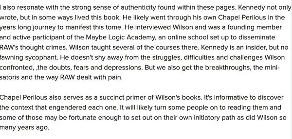 "Gabriel Kennedy's Chapel Perilous: The Life and Thought Crimes of Robert Anton Wilson is more than a biography—it attempts a multidimensional mapping of Wilson's life, philosophy, ideas, and cultural impact, rendered in a suitably Wilsonian style. "